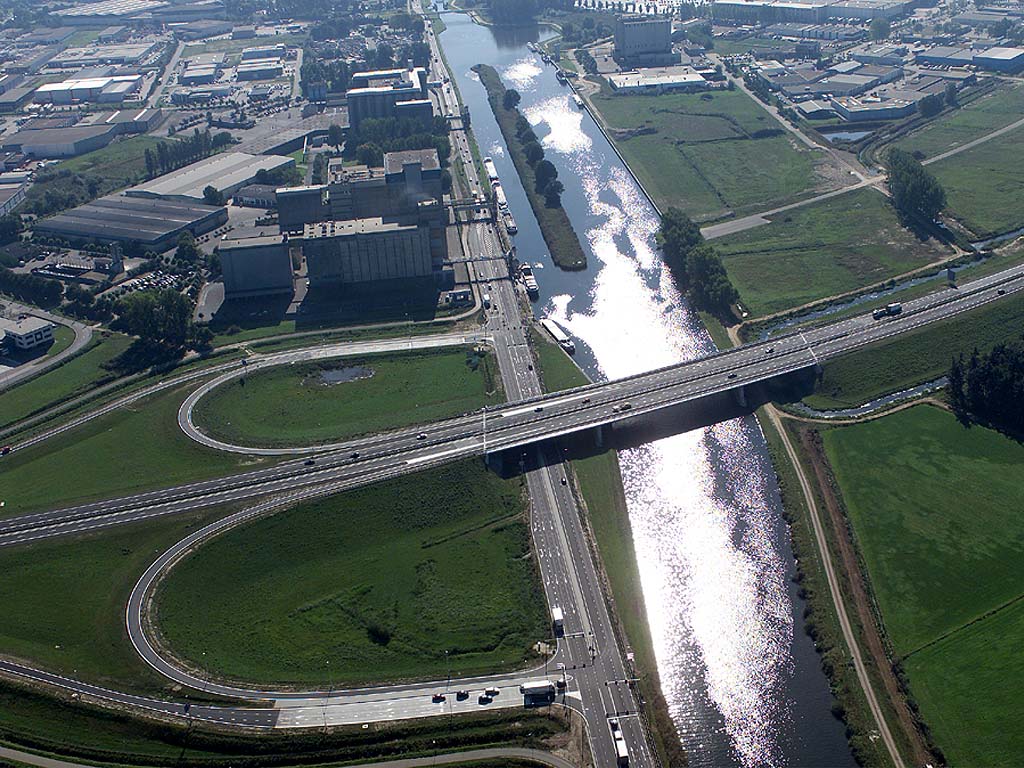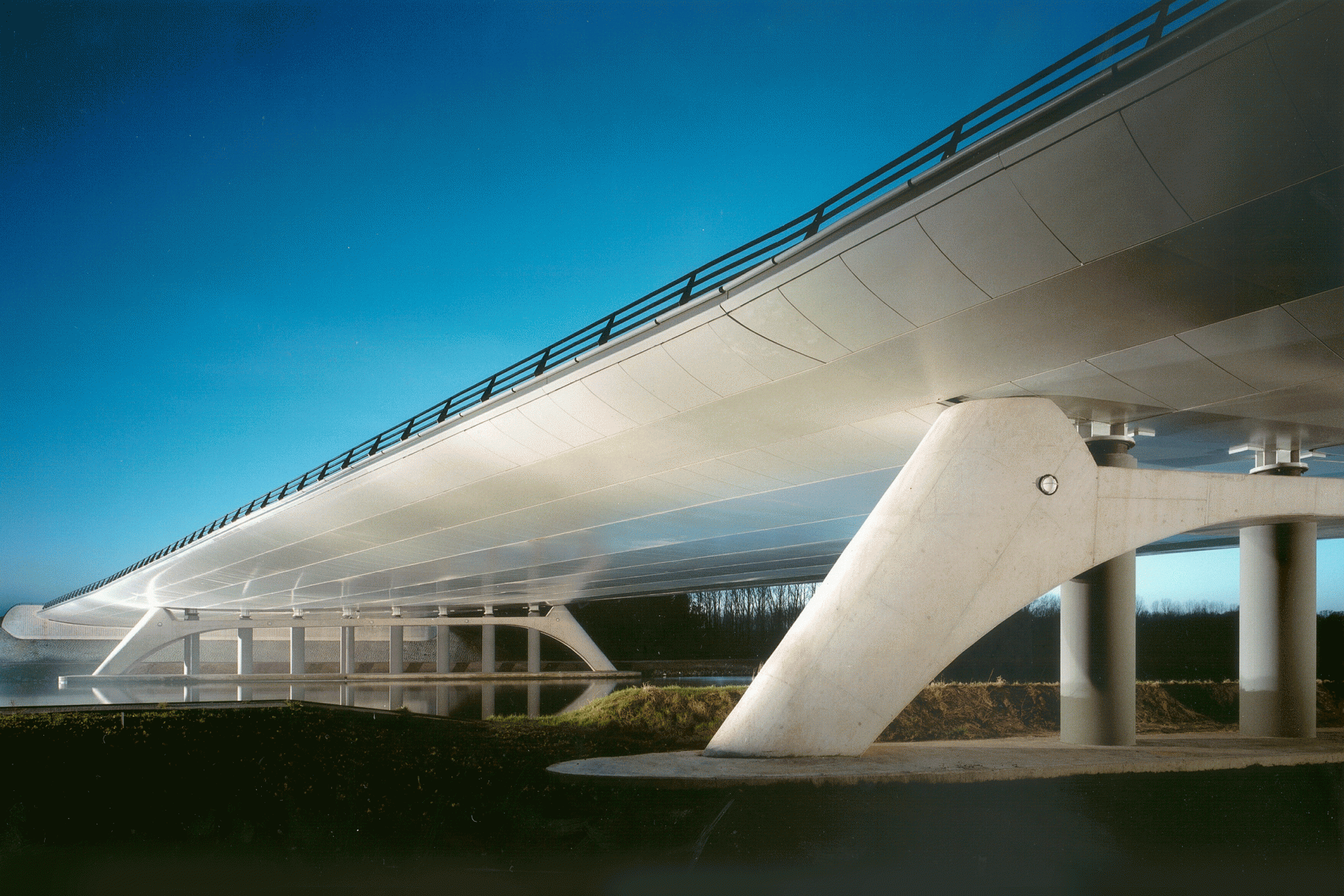 Het coulisselandschap tussen Son en Oss, waar de A50 de Zuidwillemsvaart kruist, vroeg om een zorgvuldige vormgeving bij de daar te bouwen brug. De keus viel op een plaatbrug, slank aan de randen om de constructiehoogte die al minimaal is met 1/36ste van de overspanning, visueel nog verder te verlagen.