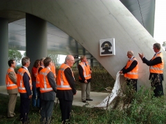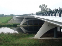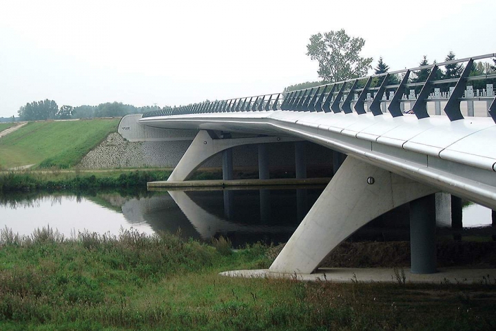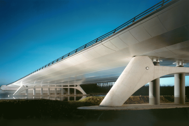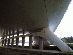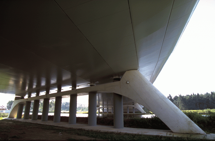 Hiermee wordt de constructie uit elkaar gehaald en zichtbaar gemaakt, terwijl tegelijkertijd de kolommen in één geheel zijn gevat. Daar waar de krachten het grootst zijn, bij de oplegging, is de constructie juist luchtig en transparant. Op de gladde onderkant spiegelt het door het water weerkaatste zonlicht. De brug lijkt te zweven.