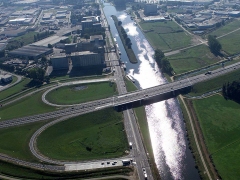 Deze platte constructie is mogelijk door een combinatie van staal en beton. Zes stalen kokerliggers zijn met deuvels verbonden aan het voorgespannen betonnen dek. Het geheel wordt aan weerszijden van de vaart gedragen door acht kolommen die even onder de kop zijn verbonden door een gestroomlijnde schoorpijler.