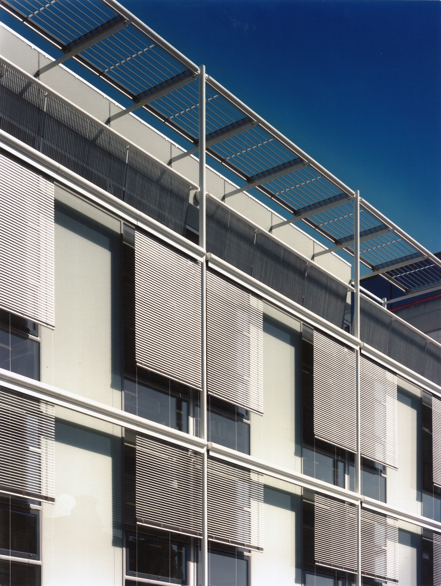 De voorgevel overbrugt het verschil in maat en schaal door er een stalen frame op te schroeven. Dat maakt de kolomafstand binnen het gebouw buiten afleesbaar. De buisconstructie vervult daarnaast een functie voor het bevestigen van hekwerken, zonwering en belettering.