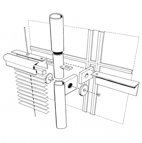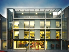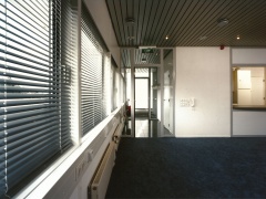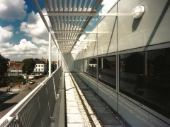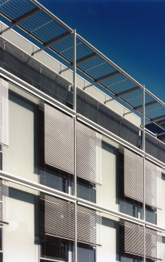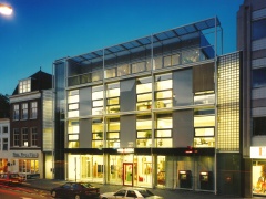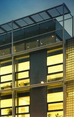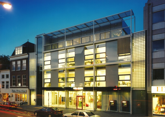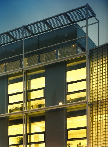Glas lost het contrast in materiaal op. Twee stroken glazen bouwstenen aan weerszijden zetten het gebouw op enige afstand van de buren. De glazen liftschacht bindt de vier bouwlagen aan elkaar. De glasgevel op het westen vraagt om zonwering aan het eind van de dag, afhankelijk van het seizoen. Soms laat de gevel zien wat er binnen gebeurt, soms ook helemaal niet.
