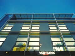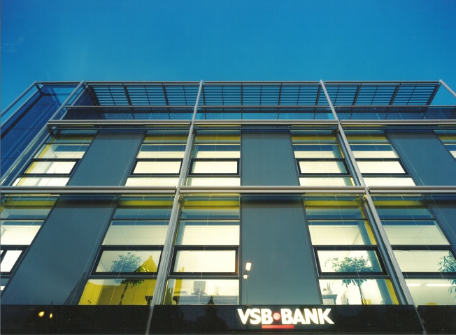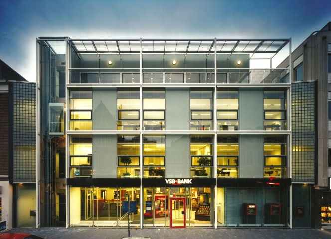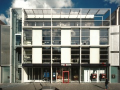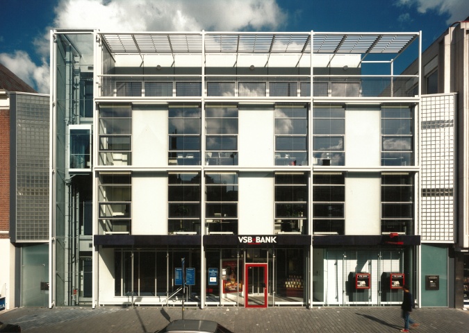 De locatie van dit bankgebouw kent aan weerszijden twee extremen. Links een bescheiden pand op de grens van de Haarlemse binnenstad, rechts een kolossaal provinciaal kantoorgebouw. Ook in materiaal kan het contrast niet groter zijn: kleinschalig metselwerk met houten kozijnen tegenover prefab beton en aluminium vliesgevels.